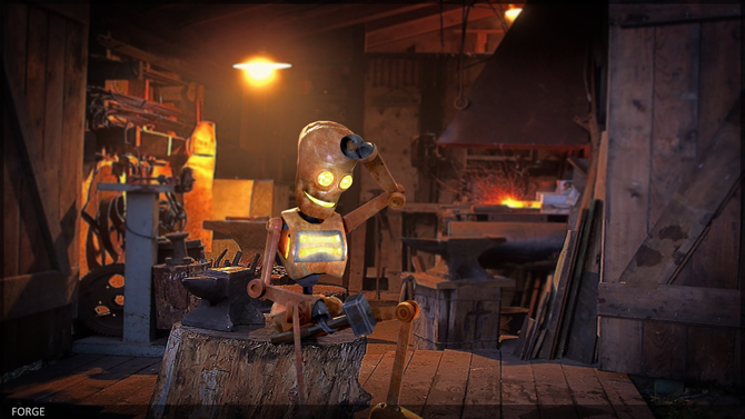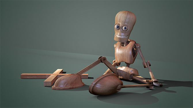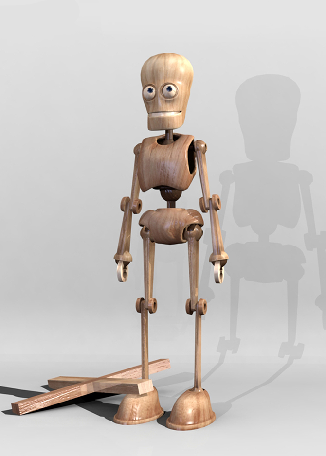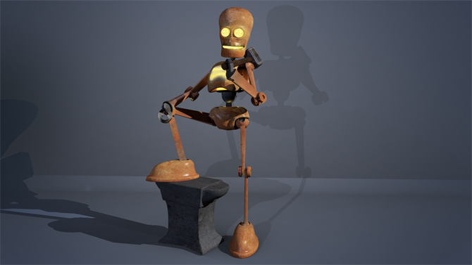 For the texturing project I created two robots - a copper furnace with fire inside and a wooden puppet. I then composited them into a photo background to sell the design.