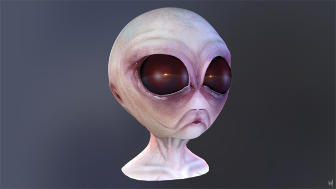I decided to attempt a classic alien shape, to see how realistic I could make it. The skin was was painted in Mudbox, then sub-surface scattering techniques were used in Maya to create semi-translucent skin.