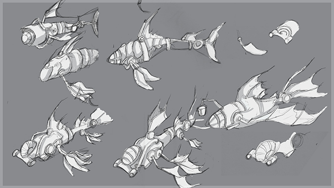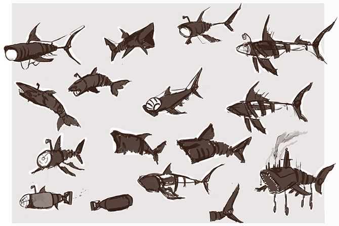 I chose the Steampunk brief, and created various submarine designed based on marine animals. I focused on the shark as I love their body shape.