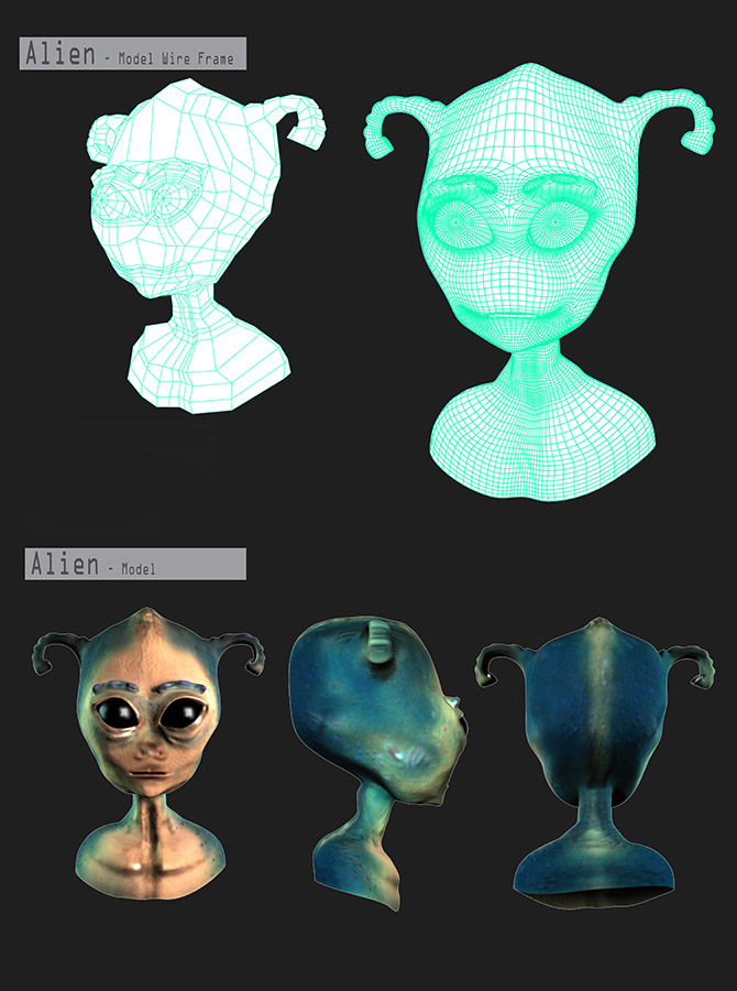 • Export back into the 3d package as a low level mesh using a Normal texture to mimic a higher polygon model